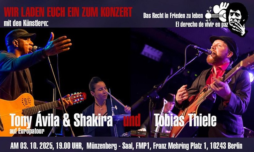 Das Berliner Publikum hat die Gelegenheit, die Kunst dieses vielseitigen Künstlers zusammen mit der kubanischen Percussionistin Shakira Torna und dem deutschen Liedermacher Tobias Thiele bei einem Konzert im Rahmen der Veranstaltungsreihe „Das Recht in Frieden zu leben" zu genießen, das vom deutschen Verein El Cultrún e.V. organisiert wird. Der Termin ist am 3. Oktober um 19:00 Uhr im Münzenberg-Saal am Franz-Mehring-Platz 1 in Berlin. Diese Vorstellung ist Teil des Europa-tours, die Tony außerdem in die Schweiz, nach Belgien, Finnland und Spanien führen wird.
