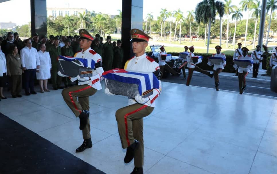Anschließend wurden die sterblichen Überreste über die Avenida Rancho Boyeros zum Sitz des Ministeriums der Revolutionären Streitkräfte gebracht. Während der Fahrt würdigte das kubanische Volk, das sich zu beiden Seiten der Straße versammelt hatte, seine Landsleute. Trotz des Regens haben dann Tausende von Frauen und Männern den kubanischen Helden im Sitz des Ministeriums der Revolutionären Streitkräfte posthume Ehre erwiesen.