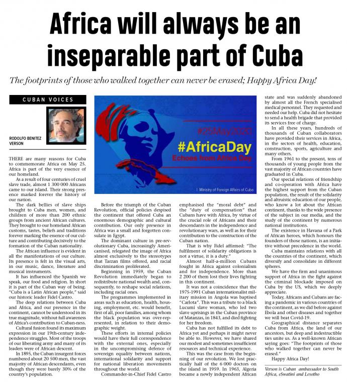 Pretoria, May 25, 2020.- There are many reasons for Cuba to commemorate Africa on this 25th day of May. Africa is part of the very essence of our Homeland.