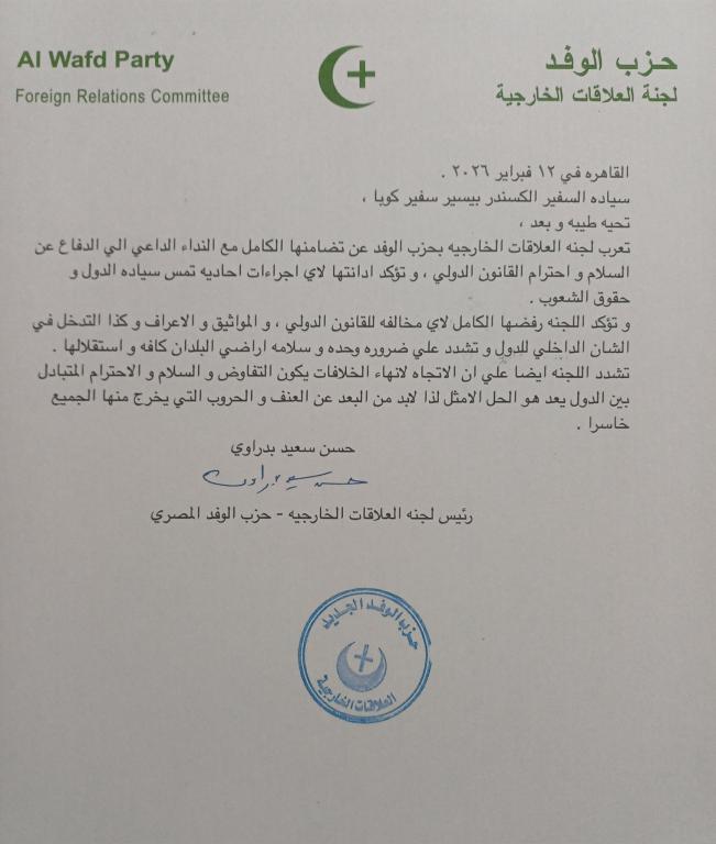 The letter was signed by Hassan Saeed Badrawi, Chairman of the Foreign Relations Committee of the Al WAFD Party.