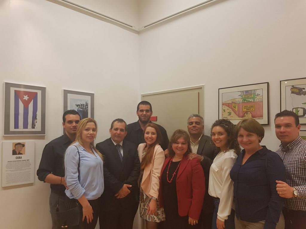 The Ambassador of Cuba in Austria, Juan Antonio Fernández Palacios and the team of the Diplomatic Mission participated in the opening of the exhibition, in which Cuban artists stand out for their fine humor and sharp criticism, pleasantly received by the audience.