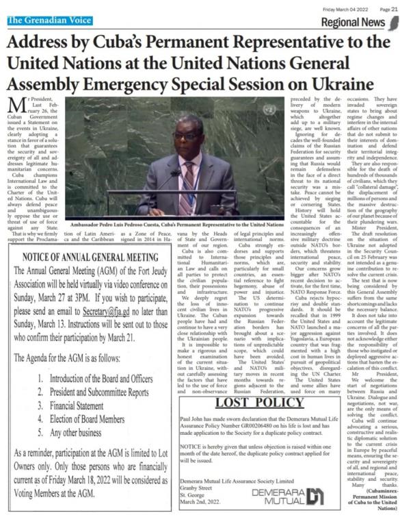 Last 26 February, the Cuban Government issued a Statement on the events in Ukraine, clearly adopting a stance in favor of a solution that guarantees the security and sovereignty of all and addresses legitimate humanitarian concerns.
