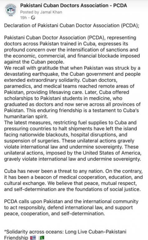 Statement by the Association of Pakistani Doctors Graduated in #Cuba against the genocidal blockade imposed on our island by the neighbor to the north. The Yankee establishment cannot accept that a small island does so much for other nations, so those who are grateful that our land has made them better men come forward and ask for an end to the hegemon's onslaught.