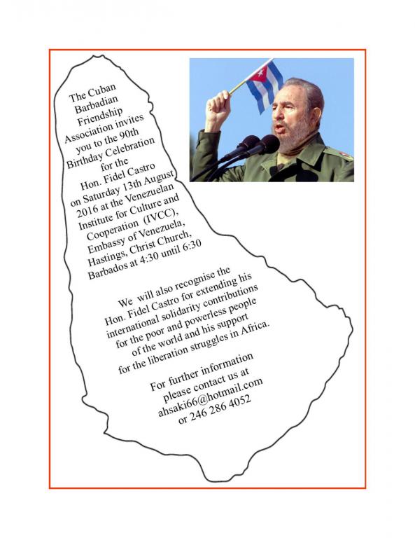 An event of such importance in the lives of the friends of the Cuban Revolution worldwide, as 90th birthday of its historic leader, the Commander in Chief Fidel Castro Ruz, could not pass unnoticed in Barbados, which was visited by him on three relevant occasions. Under this premise, many members of the various organizations members of the Movement of Solidarity with Cuba (MSC), gathered in another symbolic venue, the Institute of Cultural Cooperation of the Embassy of Venezuela, to share and highlight several moments of this legendary statesman. A documentary, edited especially for the occasion by the Head of Mission, Mr. Francisco Pérez, music played by iconic Barbadian artists, and several interventions on substantive aspects of the Commander´s life, including the representation of the brigade of Cuban coaches in the country, gave an exceptional content to this celebration, one of many that have occurred in all latitudes.