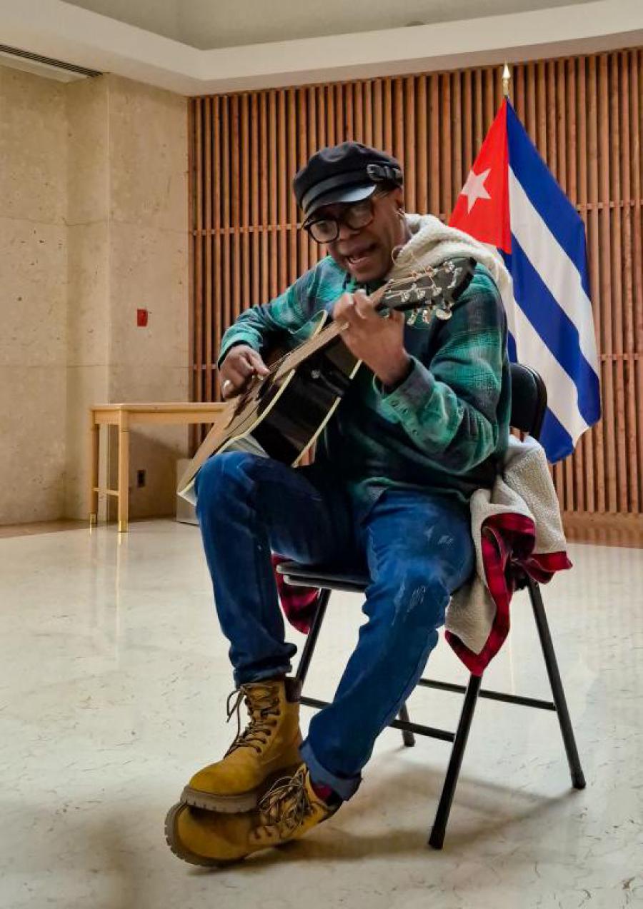 In a jovial atmosphere, in greeting to the Day for Cuban Culture, the "trovador" (troubadour) offered four of his most emblematic songs: "Se fue", "Candil de nieve", "El regreso del amigo", dedicated to Commander Hugo Chávez; and "Cabalgando con Fidel", in homage to the Commander in Chief, the latter sung in chorus by those present, who were visibly moved.