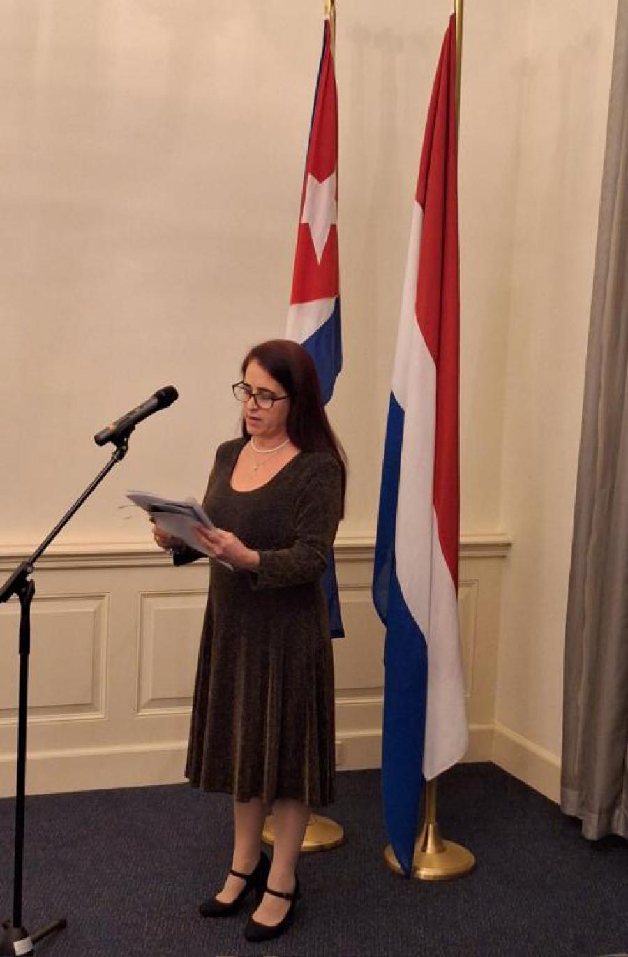 In her speech, the Ambassador thanked everyone present and made reference to Cuba's bilateral relations with the Netherlands and Luxembourg; the achievements of this Caribbean island over 65 years and its historical positions in international forums, including those in The Hague, particularly in the defense of peace, multilateralism and International Law; she thanked the Dutch and Luxembourgers for their solidarity with Cuba.