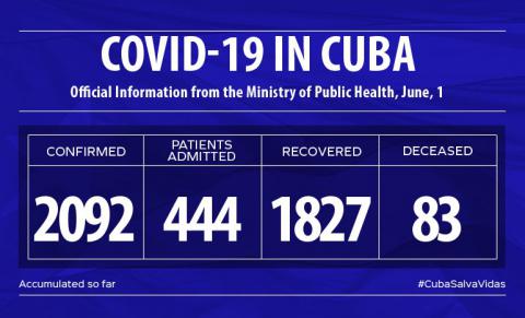 Cuba reports 9 new cases of COVID-19 over the past 24 hours | MINSAP Havana, June 2 - The National Director of Epidemiology of the Cuban Ministry of Public Health, Dr. Francisco Duran, reported that there were 9 new cases of COVID-19, for a total of 2,092 positive cases across the island. During his daily press briefing held Tuesday morning, Dr. Duran said that over the past 24 hours -- up to 12 midnight Monday night -- fortunately, no patients died from the coronavirus. A total of 83 patients have died from COVID-19 in Cuba over the past several months. To date, 1,827 patients have recovered -- with 1 patient released from hospitalization during the day on Monday. (Taken from RHC)