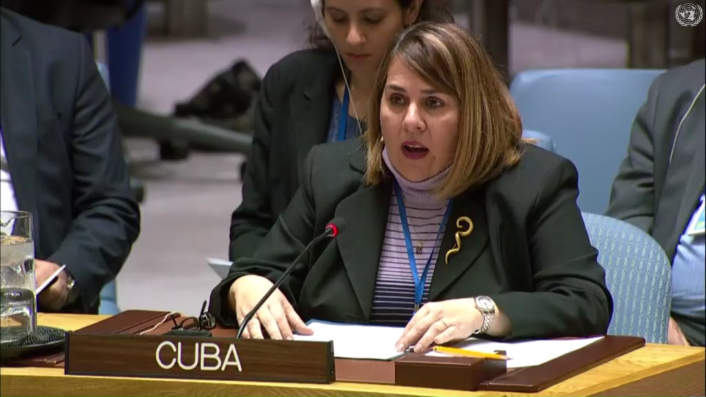 New York, October 18, 2018.In her statement at the United Nations Security Council Open Debate, on the situation in the Middle East, the Deputy Permanent Representative of Cuba to the UN, Ambassador Ana Silvia Rodríguez Abascal, regretted the lack of progress in favor of the just cause of the Palestinian people. She reflected how the situation on the ground continues to deteriorate, with arbitrary decisions such as the withdrawal of financial support from a Member State to the Relief and Works Agency for Palestine Refugees in the Middle East, which obstructs any decision within the Council to condemn Israel due to the escalation of violence and tragic events occurred in the Gaza Strip, since March 30. She demanded the Security Council to comply with the responsibility enshrined in the UN Charter, demanding that Israel immediately ends the occupation of the Palestinian territories and the aggressive policies and colonizing practices.
