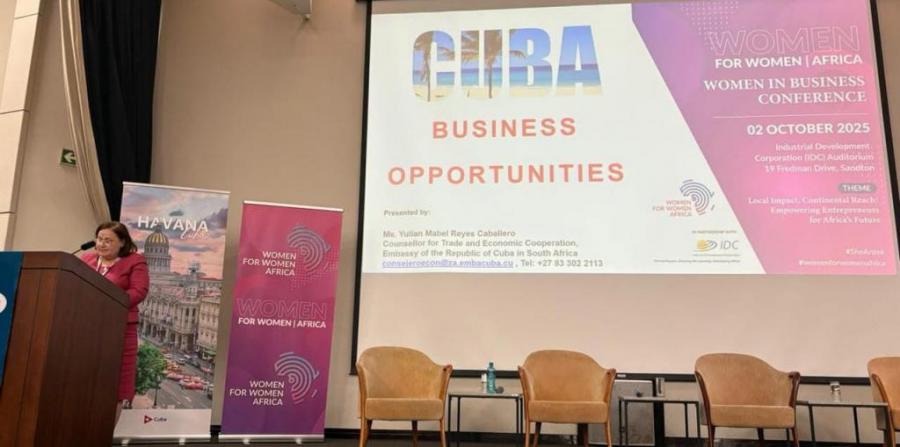 Sandton, October 2, 2025.- The head of the economic and commercial office of our embassy, Yulian Mabel Reyes Caballero, presented Cuba's business and investment opportunities at the “Women in Business” event, sponsored by the Industrial Development Corporation of South Africa.