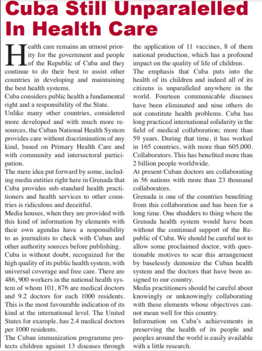 Grenada is one of the countries benefiting from this collaboration and has been for a long time. One shudders to thing where the Grenada health system would have been without the continued support of the Republic of Cuba. We should be careful not to allow some proclaimed doctor, with questionable motives to scar this arrangement by baselessly demonize the Cuban health system and the doctors that have been assigned to our country.