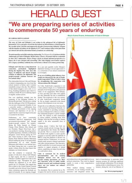 Addis Ababa, October 26, 2025.- The Ethiopian Herald published today an extensive interview with the Cuban Ambassador to the Federal Democratic Republic of Ethiopia, Meylin Suarez, in which she highlights the continued support of the Ethiopian government and people for the elimination of the economic, commercial and financial embargo imposed by the United States against Cuba.