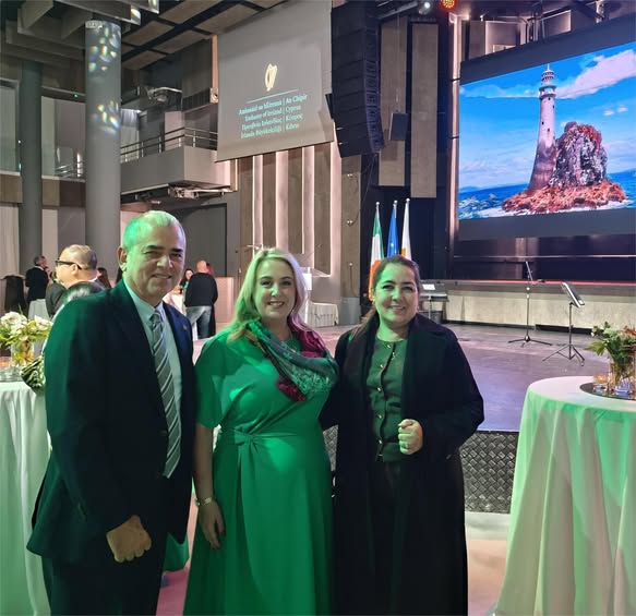 Nicosia, Cyprus, March 10, 2026.- On the occasion of the visit to this capital by the Irish Minister of Justice, Home Affairs and Immigration, Mr. Jim O'Collaghan, and invited by his Irish counterpart, Her Excellency Ms. Sarah Hamilton, the Cuban ambassador to Cyprus, Rubén Pino Martínez, attended the Reception for the National Day of the Republic of Ireland, held at the Pavilion Hall in Nicosia.