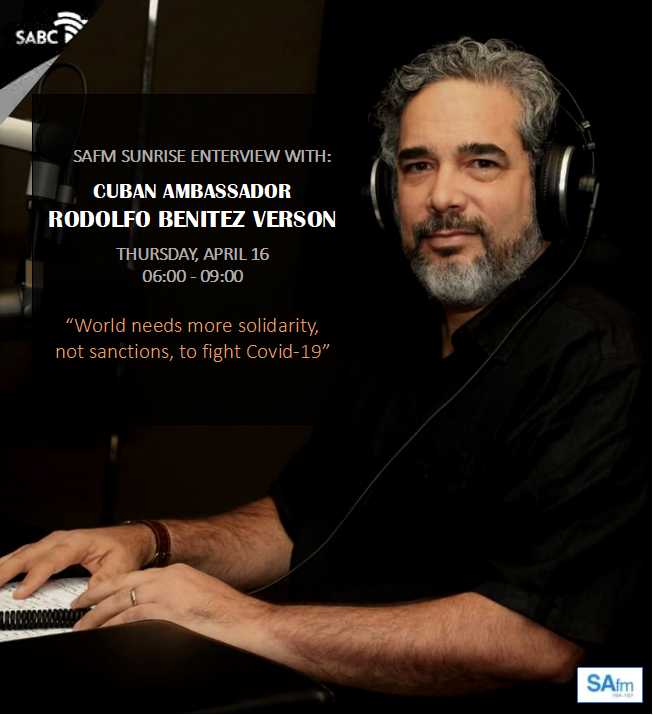 Pretoria, April 16, 2020.- The Cuban Ambassador in South Africa, Rodolfo Benítez Verson, participated as a special guest in the radio program "Sunrise", by the national station "South African FM", in its broadcast today.