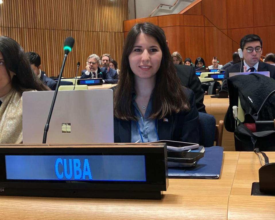 This Tuesday, Ivette Lamigueiro Cañedo, official with the Division for Multilateral Affairs and International Law of the Ministry of Foreign Affairs, participated in the informal interactive dialogue convened by the President of the General Assembly on: “Preserving human dignity in armed conflict: promoting compliance with international humanitarian law”.