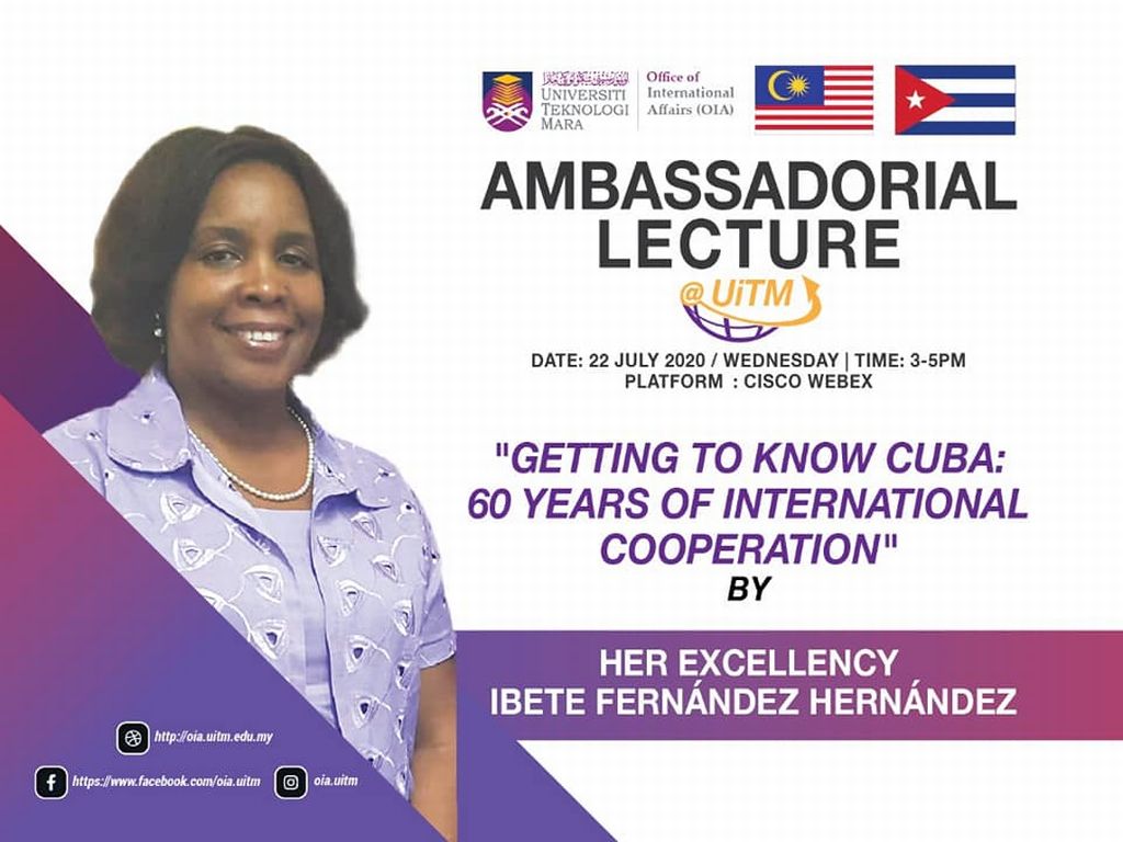 Kuala Lumpur, July 22- With the title “Knowing Cuba: 60 years of international collaboration”, the Cuban ambassador to Malaysia, Ibete Fernández Hernández, gave a conference in the virtual classroom of the University Technological Institute of Malaysia (UiTM), as part of the activities to commemorate the 45th anniversary of the establishment of diplomatic relations.