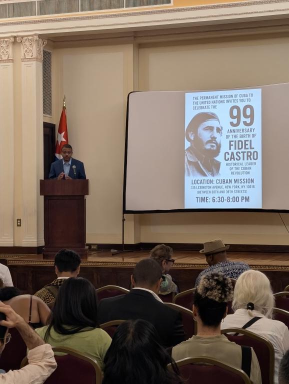 On Friday afternoon, a tribute was held at the Permanent Mission of Cuba to the United Nations to mark the 99th anniversary of the birth of the historic leader and Commander-in-Chief of the Cuban Revolution, Fidel Castro Ruz, with the participation of representatives from various US organizations in solidarity with our country. The event was part of the commemorations leading up to the centenary of the historic leader of the Cuban Revolution, to be celebrated in 2026.