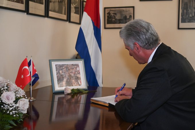 On Wednesday afternoon, the First Secretary of the Party Central Committee and President of the Republic, Miguel Díaz-Canel Bermúdez, signed at the Embassy of the Republic of Türkuiye in Havana, the book of condolences opened in honor of the victims of the recent high-intensity earthquake. The Head of State was accompanied by First Deputy Minister of Foreign Affairs, Gerardo Peñalver Portal, Deputy Minister of Foreign Affairs, Anayansy Rodríguez Camejo, as well as other senior MINREX officials.