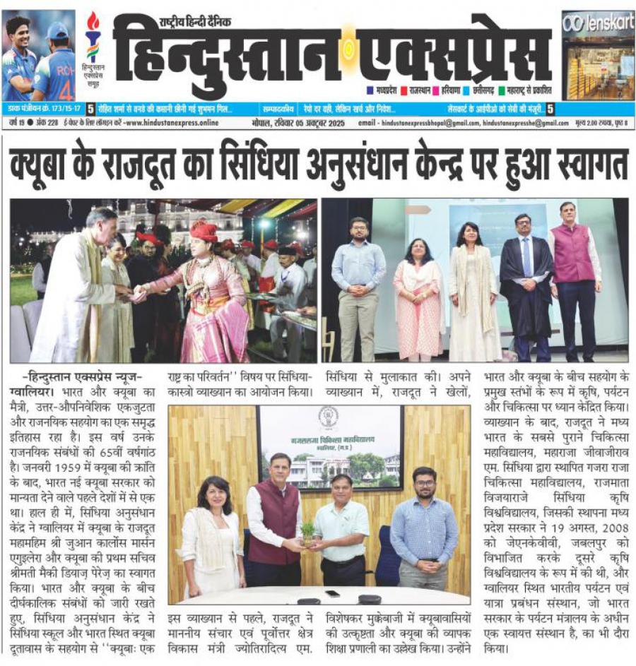Gwalior, October 4th, 2025.- Regarding the visit of Ambassador Juan Carlos Marsan Aguilera to the Scindia Research Centre in Gwalior, several newspapers have highlighted the visit by the Cuban diplomat as an expression of the deep relationship that unites both peoples. The Digital Economic Times of India published an interesting article covering 65 years of bilateral relations between Cuba and India. Noting key milestones in the bilateral relationship, from the meeting of the Commander-in-Chief, Fidel Castro and leader J. Nehru, in Harlem to the most recent meeting between President Miguel Díaz Calen and Prime Minister S. Narendra Modi, The historical relationship between Cuba and India has been based on mutual respect, solidarity and close cooperation in the face of common challenges as States of the Global South. In the context of the 65th anniversary of the establishment of bilateral political relations, this article highlights the principles that have consolidated a historical relationship and reaffirms the numerous existing possibilities for its strengthening.