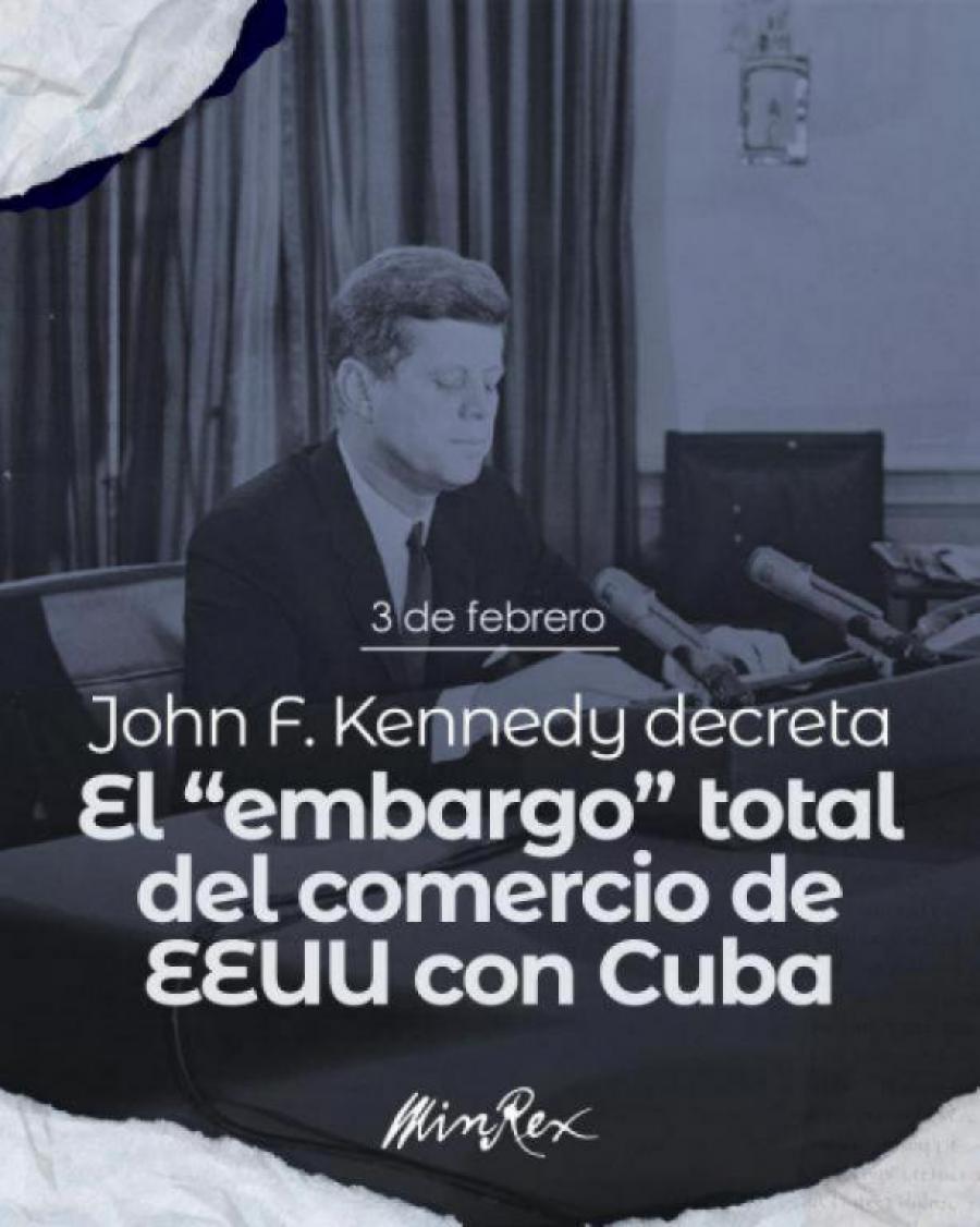 Ο δημοκρατικός πρόεδρος Τζον Φ. Κένεντι υπέγραψε στις 3 Φεβρουαρίου 1962 την Εκτελεστική Διαταγή 3447, μέσω της οποίας καθιερώθηκε ο οικονομικός, εμπορικός και χρηματοοικονομικός αποκλεισμός που επιβλήθηκε από τις Ηνωμένες Πολιτείες κατά της Κούβας. Αυτή η απόφαση, που σχεδιάστηκε με την πρόθεση να εμποδίσει τη λειτουργία της κουβανικής οικονομίας και να υπονομεύσει την υποστήριξη του λαού προς την Επανάσταση, βασίστηκε στην εφαρμογή του Νόμου Εμπορίου με τον Εχθρό του 1917, που αρχικά εγκρίθηκε στο πλαίσιο του Πρώτου Παγκοσμίου Πολέμου εναντίον της γερμανικής αυτοκρατορίας και των συμμάχων της. Από τότε, η στρατηγική της πολιορκίας και της οικονομικής ασφυξίας εδραιώθηκε ως κεντρικό στοιχείο της αμερικανικής πολιτικής απέναντι στην Κούβα, με στόχο να περιορίσει το δικαίωμα του κουβανικού λαού να ασκεί την κυριαρχία του και να οικοδομήσει ένα ανεξάρτητο σχέδιο, απαλλαγμένο από την αυτοκρατορική υποταγή.