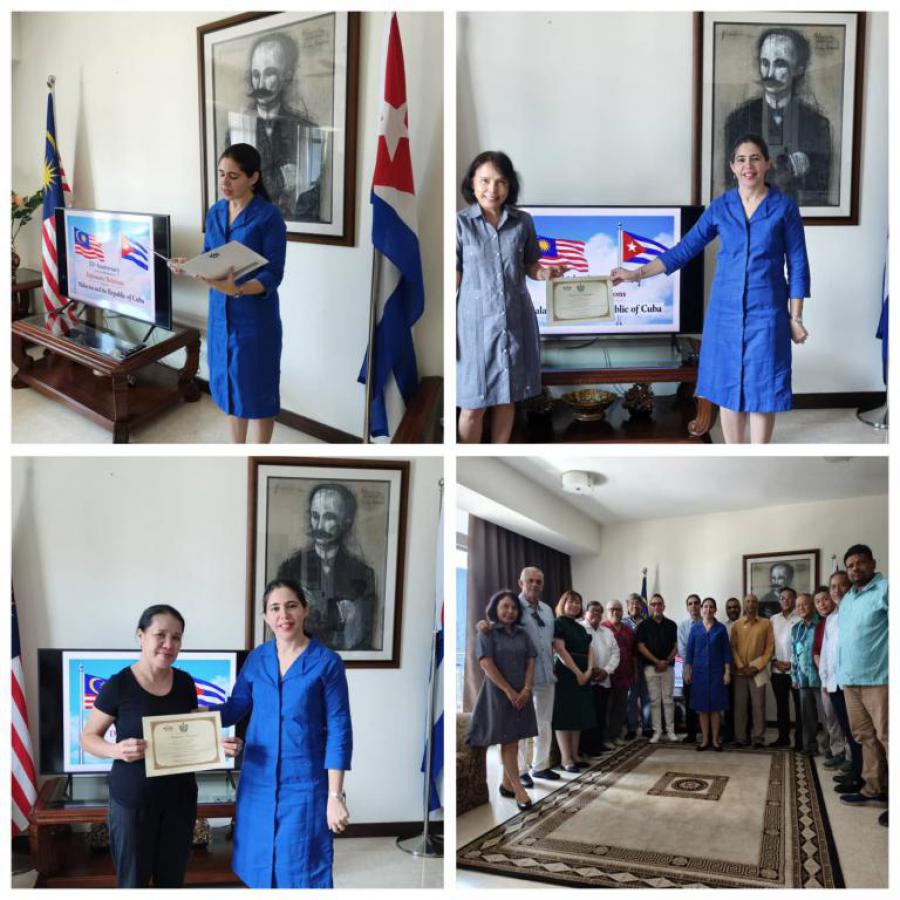 A Certificate of Recognition for their work was presented to the members of the Friends of Cuba Association in Malaysia (FOCA). And in a very special moment, Certificates of Recognition were also presented to two members of the staff of the Cuban Embassy in Malaysia: to Wong Sook Fun and to Evelyn Discaya Ancheta, for their 23 and 18 years of service, respectively, and their contribution to the work of the Cuban diplomatic mission in Malaysia.