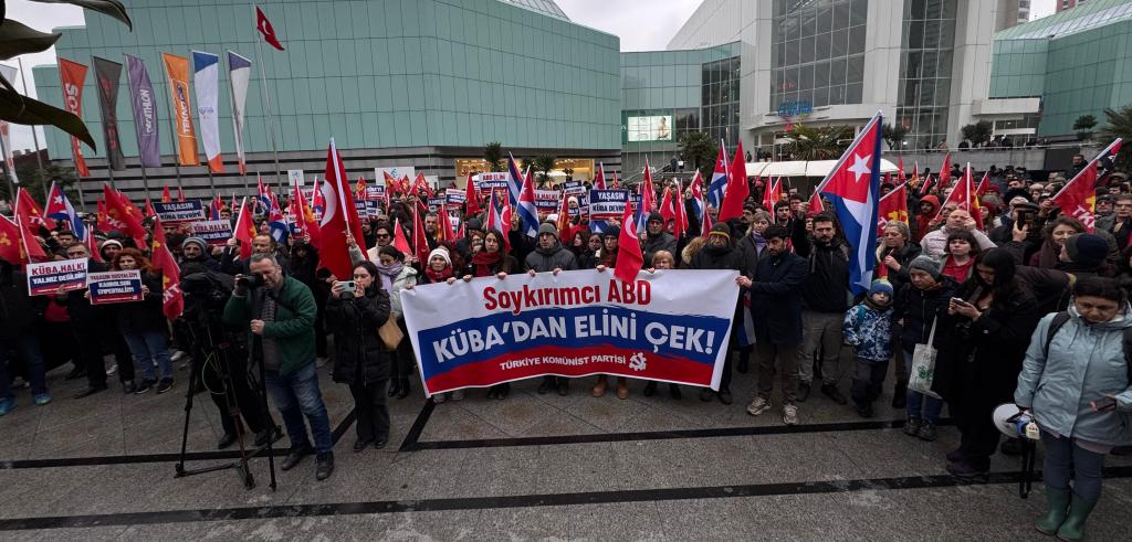 The demonstration took place in front of the Şişli Cevahir shopping mall, where militants and supporters displayed banners reading “U.S. genocidal state, do not touch Cuba.” The action was also held in opposition to the executive order signed on January 29 by U.S. President Donald Trump, which further tightened coercive measures and restricts the entry of oil into Cuba, deepening the energy crisis facing the country.
