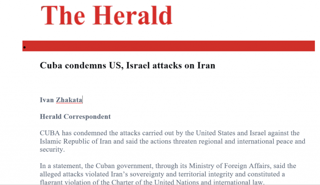 Harare, March 2, 2026 – The Herald, Zimbabwe's leading newspaper, today reported Cuba's strong condemnation of the US and Israeli attacks on Iran, which it considers a threat to regional and international peace and security.