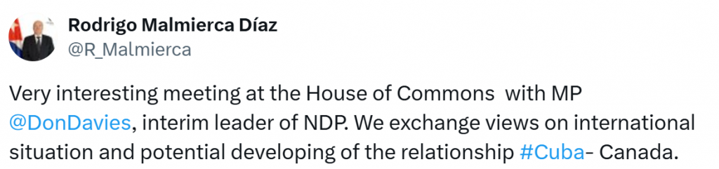 In a very interesting meeting, described as such by the Cuban Ambassador on social network X, both parties exchanged views on the international situation and the potential development of relations between Cuba and Canada.