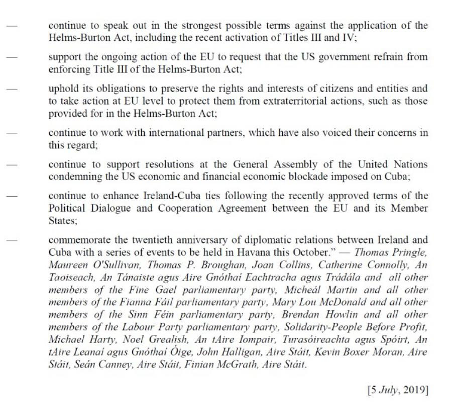 Aug072019 Dublin, August, 2019. Below is the final motion of Parliament, already published, as well as the list of signatories.@CubaMINREX@embacubairlanda Etiquetas: #Cuba #Ireland #NoMasBloqueo #CubaVsBloqueo #UnBlockCubaCategoría: BloqueoEventosRelaciones BilateralesSolidaridadRSS Minrex: