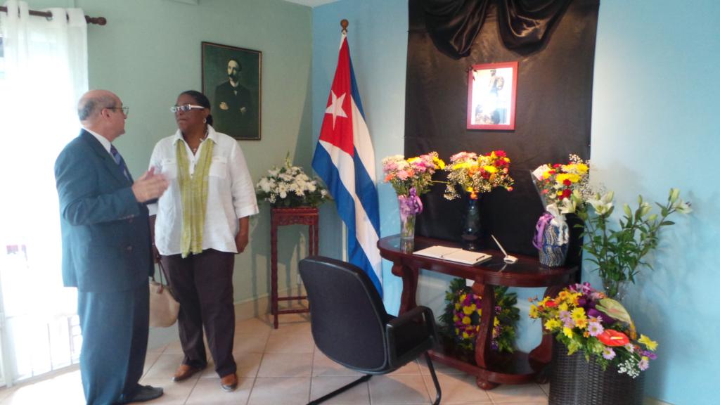 The Honorable Mia Mottley, Leader of the Labor Party of Barbados and the Opposition in Parliament, visited the Embassy of Cuba to sign the book of condolences on the death of Fidel. Identifying him as one of the most brilliant dignitaries in the Caribbean and a friend of the BLP, he emphasized that because of his courage, his commitment to fight and improve the lives of the people, not only in Cuba, but also in other regions, as well as his South Africa remains a beacon and an inspiration for future Caribbean leaders.