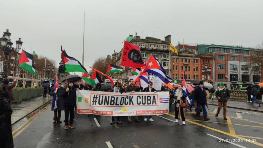 Dublin, February 22, 2026. At noon yesterday, Saturday, convened by the Communist Party of Ireland, as part of actions in support of Palestine, hundreds of demonstrators marched through the streets of the Irish capital to also denounce the actions against the Cuban people.
