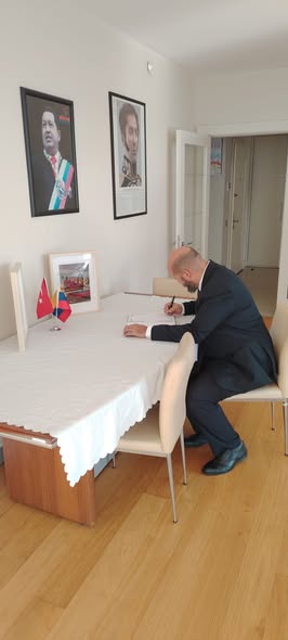 Members of the Consulate General in Istanbul, headed by the Consul General, Raúl E. Madrigal Cárdenas, paid a visit today to the Consulate General of Venezuela in this city to sign the Book of Condolences in honor of the combatants who lost their lives defending the sovereignty of the Venezuelan people in the face of the attacks perpetrated by the armed forces of the United States on January 3, 2026, when the kidnapping of President Nicolás Maduro and his wife Cilia Flores took place.