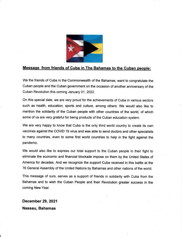 Message from friends of Cuba in the Bahamas to the Cuban people