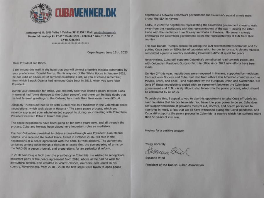 The Danish Cuban Friendship Association, has recently sent a letter to the President of the United States, Joe Biden, in which it is express the feelings of the friends of Cuba, in Denmark, regarding the insane decision of the Trump Administration, to incorporate Cuba into the List of States Sponsors of Terrorism.
