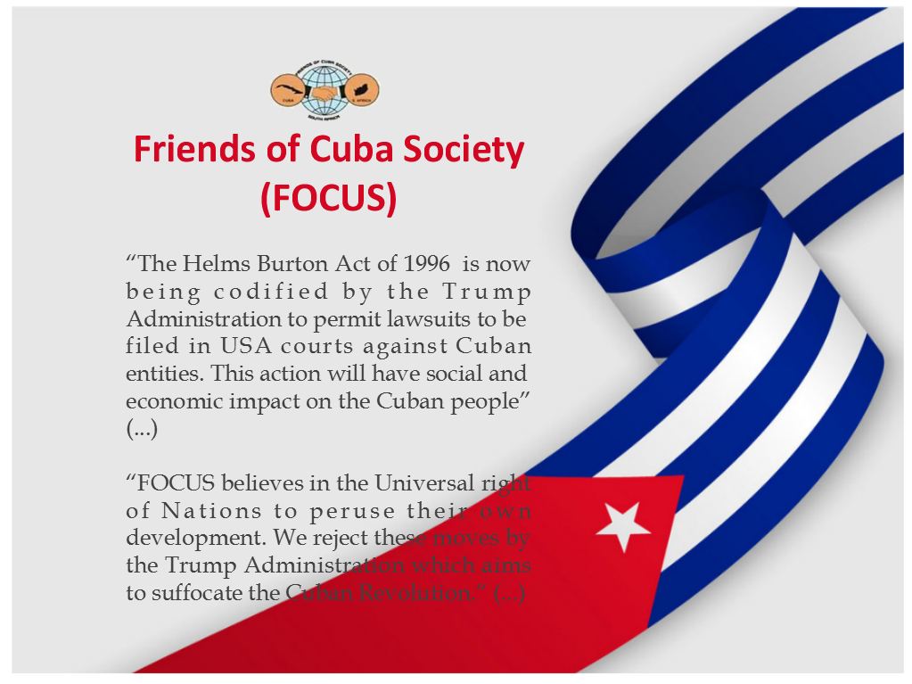 Pretoria, 12 July, 2019.- The Friends of Cuba Society (FOCUS) joins millions of people around the world to condemn the latest Trump Administration aggressive measures towards Cuba which aims to extend its illegal blockade against Cuba. The Helms Burton Act of 1996 is now being codified by the Trump Administration to permit lawsuits to be filed in USA courts against Cuban entities.