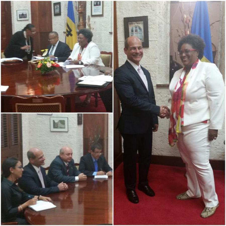 The Honorable Mia Amor Mottley, Prime Minister of Barbados, accompanied by her Chancellor, Senator Jerome Walcott, received Cuban Vice Chancellor, Rogelio Sierra, during his official visit to this country from June 9 to 11, as part of a working tour by several Caribbean islands together with the director of the Caribbean and Central America of the Cuban chancellery, Jorge Luis Mayo, in the framework of the 45th anniversary of diplomatic relations. The Cuban ambassador to Barbados, Francisco Fernández, was in attendance. It was a fruitful meeting in which the Prime Minister, in which she received congratulations from the Cuban President for her election and sent him back a similar congratulatory message for his also recent election as President of the Councils of State and Ministers of Cuba. She shared a comprehensive review of the most relevant issues on the bilateral agenda, setting the guidelines for the next actions in the areas of education, health, culture, sports, commerce and business, all aimed at strengthening the relationships that have reached their 45th anniversary. For his part, the Vice Minister extended an invitation from President Diaz-Canel Bermúdez for the Prime Minister Mottley to make an official visit to Cuba, which was also in return reciprocated by her. Barbadian Vice Chancellor Simone Rudder, the director of the Caribbean Unit, Sandra Gittens, the new Chargé d'Affaires in Cuba, Philip St. Hill, and the Cuban Desk official in the chancellery, Corey Archer, were present and made their contributions at the meeting. (Cubaminrex - Embacuba Barbados).