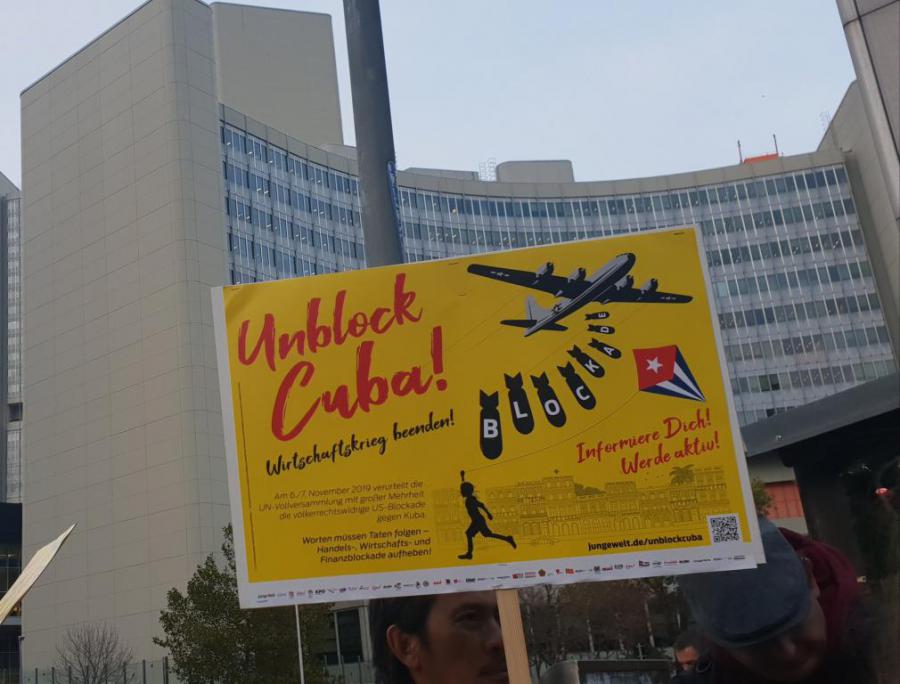 Vienna, 6 November 2019. The Square of the United Nations, in front of the headquarters of this International Organization in Vienna, was the scenario of an extensive popular gathering, which demanded the end of the blockade that the United States has been imposing for almost 60 years against Cuba.
