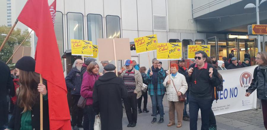 The demonstrators who were summoned by "ÖKG", the Austria-Cuba Friendship Association carried posters and flags and expressed public support for the draft resolution entitled “Necessity of ending the economic, commercial and financial embargo imposed by the United States of America against Cuba”, which Cuba is submitting at the United Nations General Assembly for the twenty-eighth time, on 6 and 7 November.
