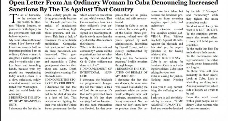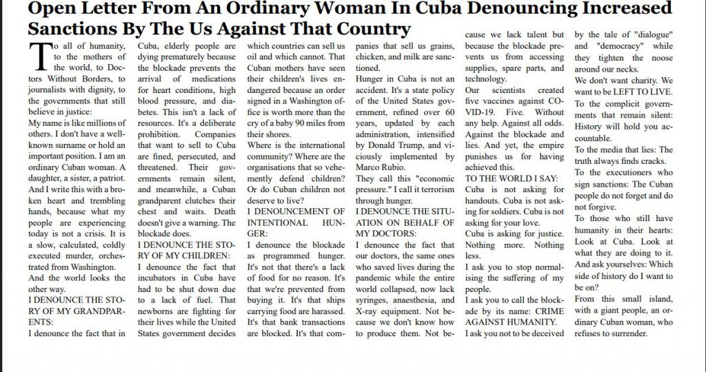 Publication in Granada media of an open letter from an ordinary woman in Cuba denouncing the increase in US sanctions