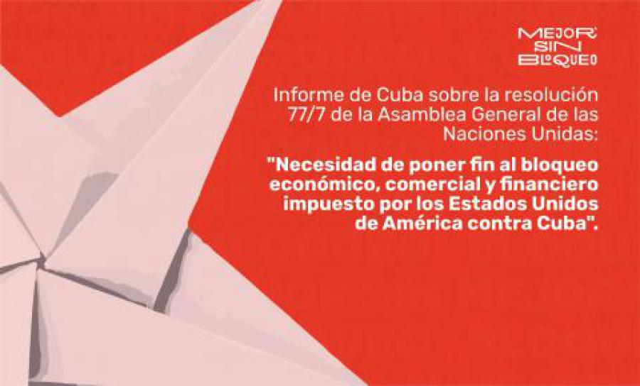 For more information, please visit: Informe de Cuba en virtud de la resolución 77/7 de la Asamblea General de las Naciones Unidas, titulada “Necesidad de poner fin al bloqueo económico, comercial y financiero impuesto por los Estados Unidos de América contra Cuba”