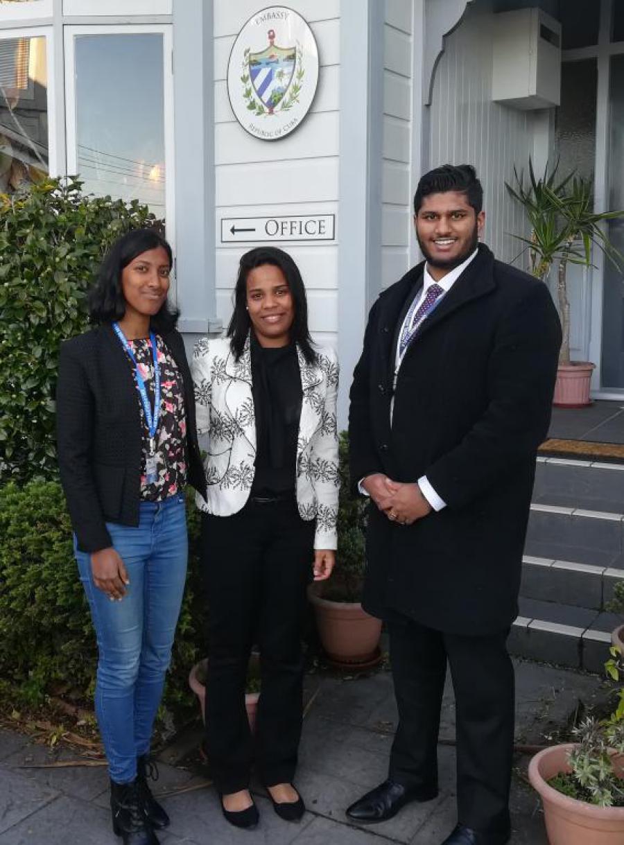 Wellington, July 10th, 2018. In a relaxed atmosphere, the third secretary Saimin Fis Abad held a fruitful exchange with Aneesa Delpachitra, a student at Newlands College who will represent Cuba in the United Nations Model of New Zealand, the main event that is organized by the UN Youth New Zealand, would be attended by more than 270 delegates from all over the country and will be held at Victoria University from July 10 to 13.