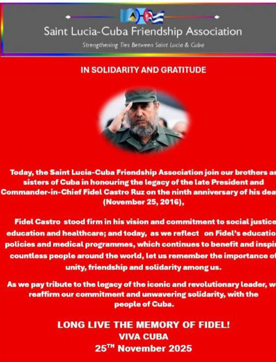 Castries, November 25, 2025 – The Saint Lucia-Cuba Friendship Association joins the international tribute to Fidel Castro on the 9th anniversary of his death.