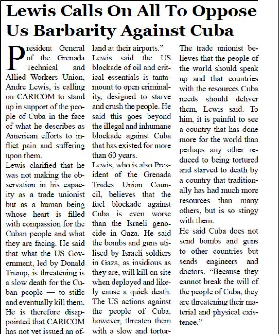 Andre Lewis, general president of the Technical and Allied Workers Union of Grenada, has urged the Caribbean Community (CARICOM) to strongly condemn what he describes as “barbarism” by the United States against Cuba. In a public statement, Lewis denounced the blockade of oil and essential goods as a criminal and inhumane act that threatens the lives of millions of Cubans.