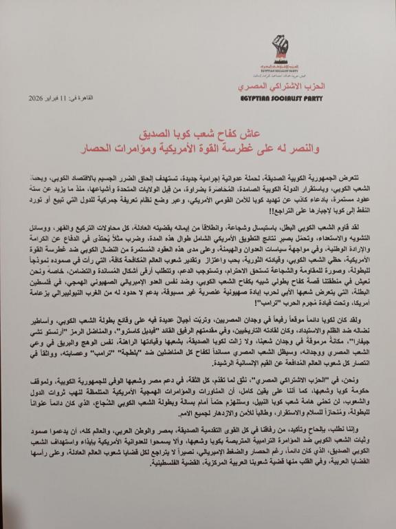 We, in the Egyptian Socialist Party, have complete confidence in the support of Egypt and its loyal people for the Republic of Cuba, as well as in the stance of its government and people. We are absolutely certain that the savage maneuvers and conspiracies of the United States, which yearns to plunder the wealth of nations and peoples, will not break the spirit of the noble Cuban people. Inevitably, these conspiracies will be defeated by the courage and heroism of the valiant Cuban people, who have always been a beacon of heroism, aligned with peace and stability, and aspiring to security and prosperity for all nations.