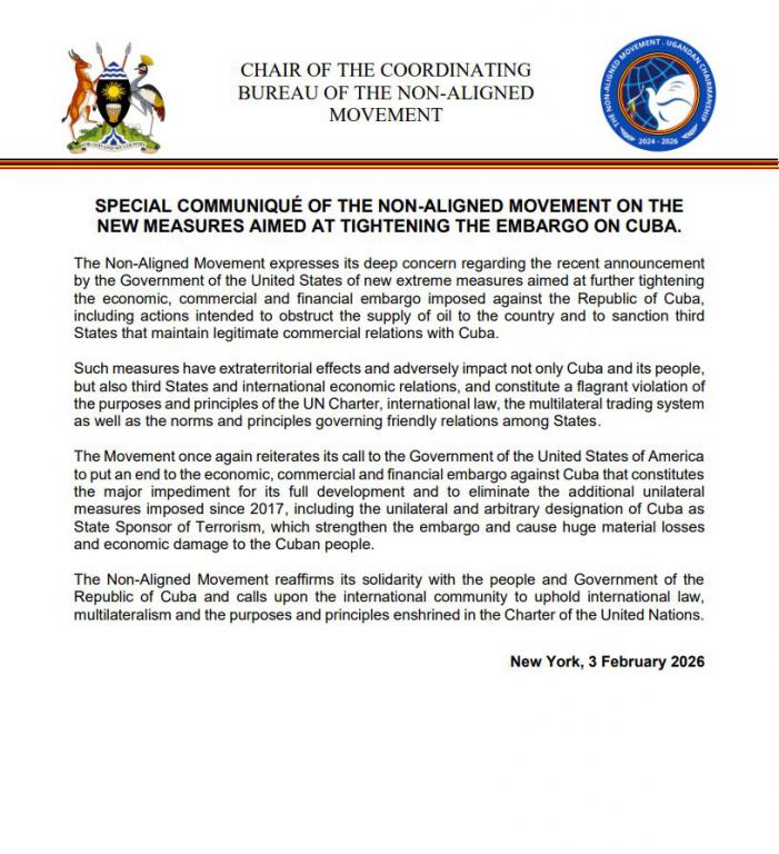 The Non-Aligned Movement reaffirms its solidarity with the people and Government of the Republic of Cuba and calls upon the international community to uphold international law, multilateralism and the purposes and principles enshrined in the Charter of the United Nations.