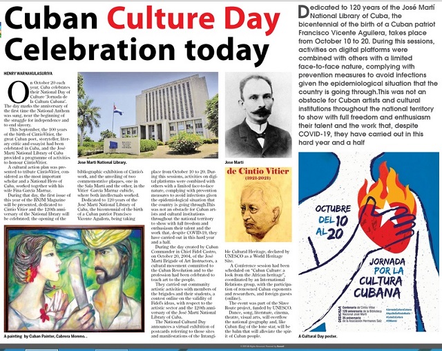 Sri Lanka, October 20, 2021, Today October 20, Cuban Culture Day, the Colombo newspaper “Daily News” reports on the celebration of the Cuban Culture Day with an article written by Henry Warnakulasuriya, writer and film critic.