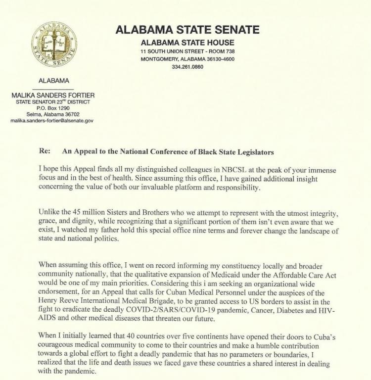 The state senator for the 23rd district of the state of Alabama, Malika Sanders Fortier, addressed a letter to the National Conference of Black State Legislators urging that organization to promote access to US territory. Henry Reeve International Brigade in order to help eradicate deadly diseases such as cancer and diabetes, as well as promote that African-American students may be eligible and study at the Latin American School of Medicine in Havana.