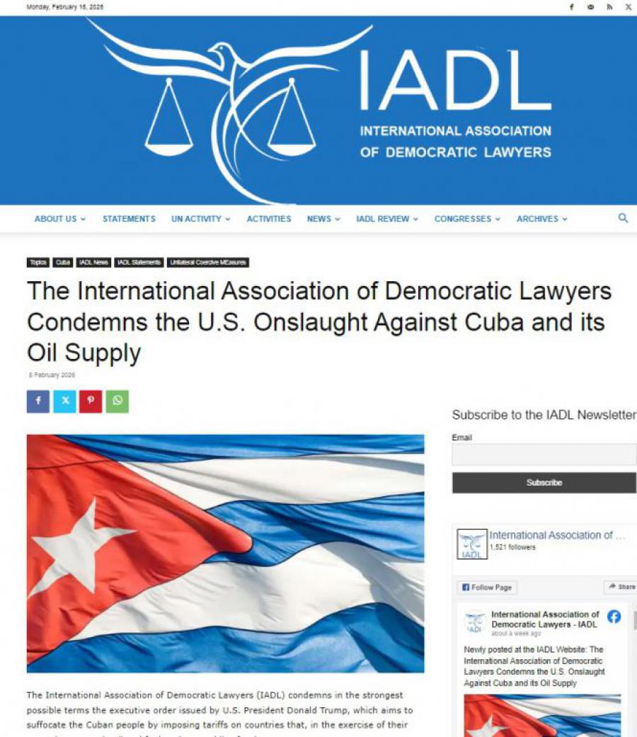 The International Association of Democratic Lawyers (IADL) condemns in the strongest possible terms the executive order issued by U.S. President Donald Trump, which aims to suffocate the Cuban people by imposing tariffs on countries that, in the exercise of their sovereignty, supply oil and fuel to the Republic of Cuba.