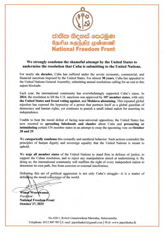 We urge all member states of the United Nations to stand firm in defense of justice, to support the Cuban resolution, and to reject any manipulation aimed at undermining it. By doing so, the international community will reaffirm the right of every independent nation to determine its own path, free from coercion or external interference.