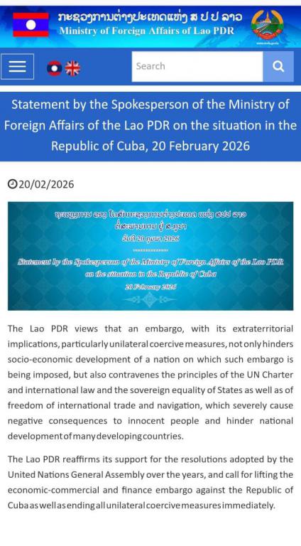 Vientiane 20 de febrero de 2026. Statement by the Spokesperson of the Ministry of Foreign Affairs of the Lao PDR on the situation in the Republic of Cuba, 20 February 2026