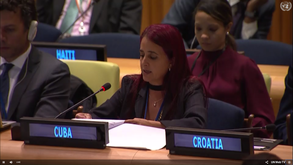 New York, October 8, 2018.In her statement on Item 86: "The Rule of Law at the national and international level," from the agenda of the Sixth Committee of the United Nations, the Director of International Law at the Ministry of Foreign Affairs Anet Pino Rivero, condemned and demanded the immediate repeal of all the extraterritorial regulations sustaining the economic, commercial and financial blockade imposed by the United States Government on Cuba for more than 50 years and urged the immediate compliance with the innumerable resolutions adopted by the General Assembly on the matter as well as with the provisions of paragraph 9 of the High-Level Declaration on the Rule of Law that: "urges States to refrain from promulgating and applying any unilateral economic, financial or trade measure not in accordance with International Law and the Charter of the United Nations that impede the full achievement of economic and social development, particularly in developing countries."